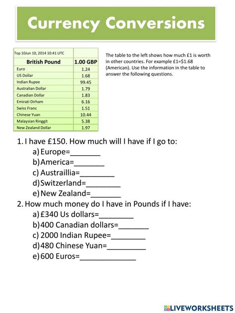 currency conversion maths worksheet